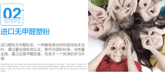 2、進(jìn)口塑粉無甲醛粉末,一種靜電噴涂用熱固性粉末涂料,通過重金屬檢測(cè)認(rèn)證,更符合國(guó)標(biāo)標(biāo)準(zhǔn),決絕重金屬,真正遠(yuǎn)離甲醛危害,給孩子一個(gè)純凈的學(xué)習(xí)環(huán)境。